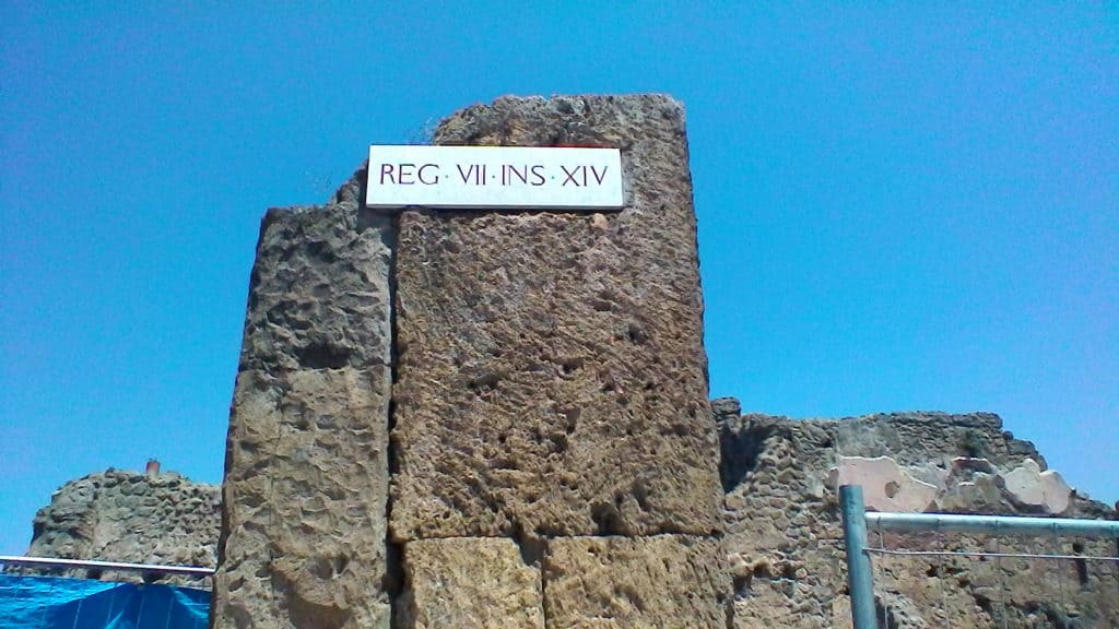 At 0730 hours we’re in Reg.VII Ins. XIV – Civic IX if you want the exact co-ords. Pompeii is divided in to nine large regions (regio). Each region is sub-divided in to Insulae. These are areas bounded by roads and streets. If you’re from the Bronx, a ‘block’. Finally, each building in a particular Insula is given a number. Some of the Insulae, likes ours, have many buildings. Others just contain one enormous town house belonging to a city big-wig.